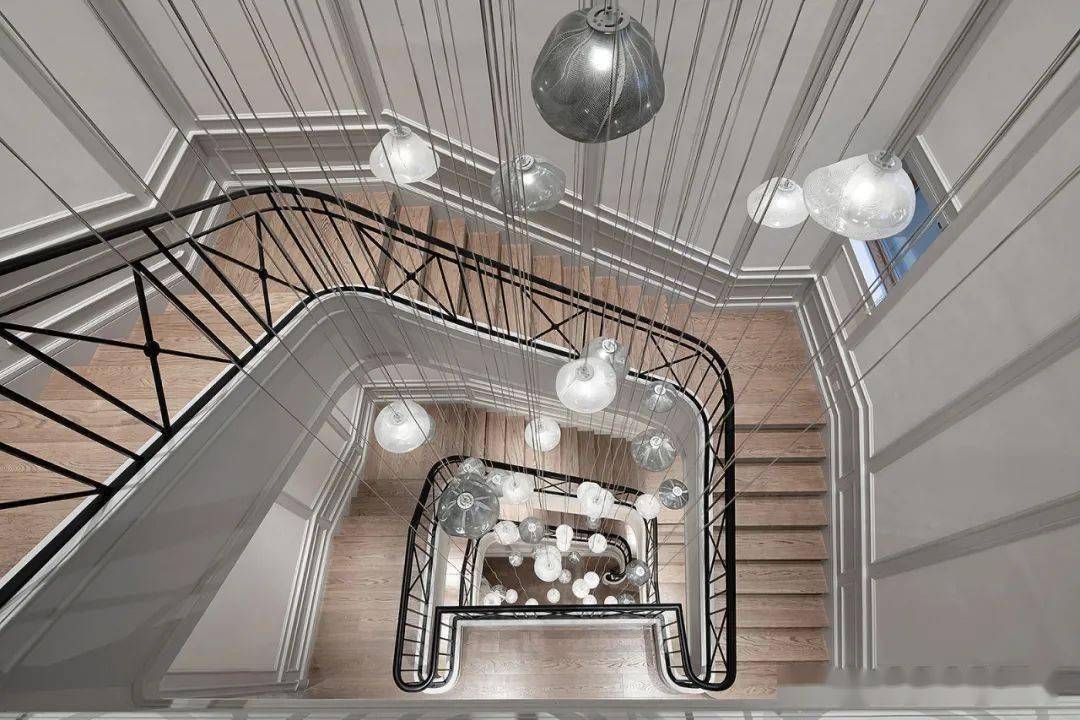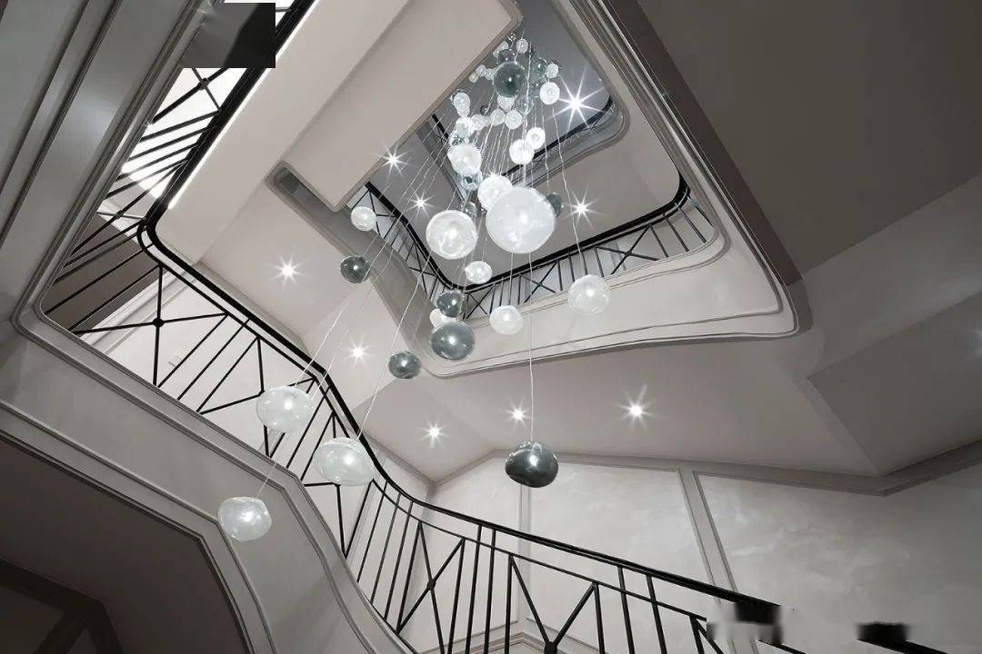 楼梯间的吊灯若隐若现,如星河散落人间,美好而纯粹。造型感十足的楼梯间本就如同一件艺术品,再相伴挂画、雕塑点缀其中,大美无形的凝聚力就是这个家最好的内在性格。