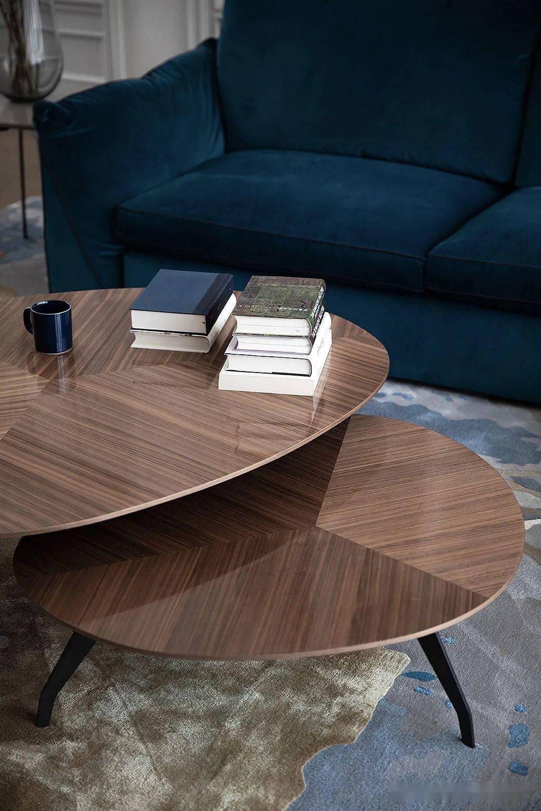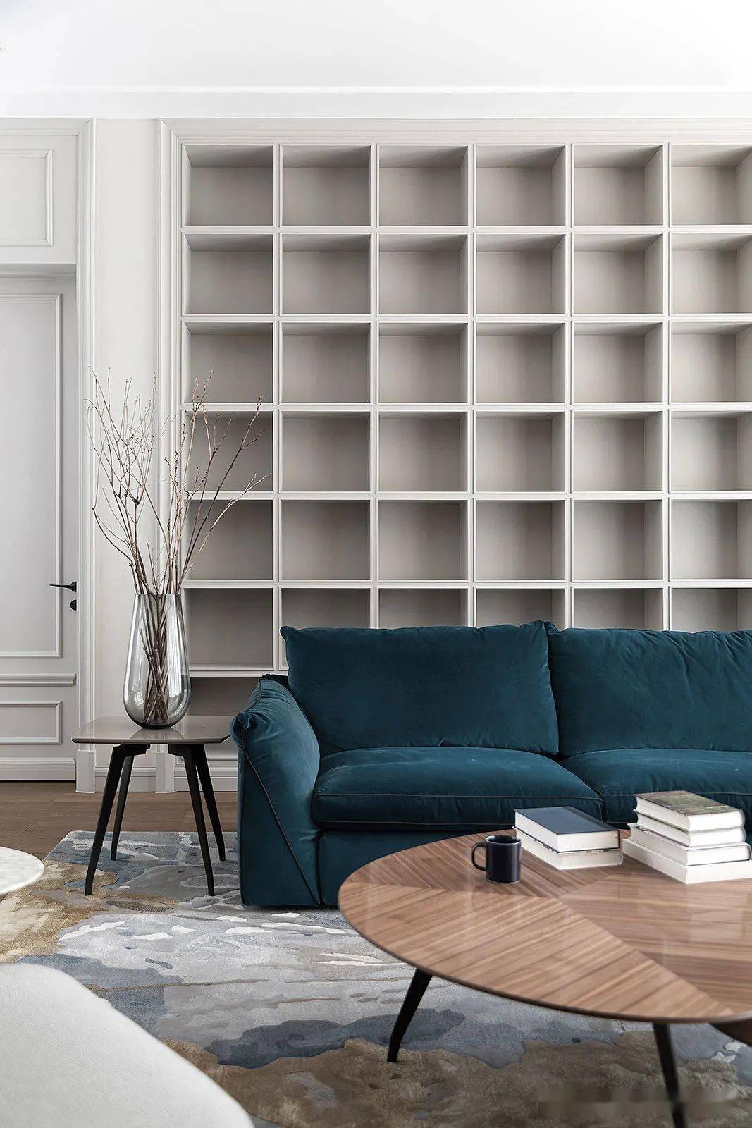 客厅开阔自由,有现代设计中干净、简约,大开大合的洒脱、轻盈美感,也有法式线条勾边,精心却不抢眼的内敛精致美感。在这里一切家具、装饰都在退让,只保留纯粹的蓝与白营造氛围。