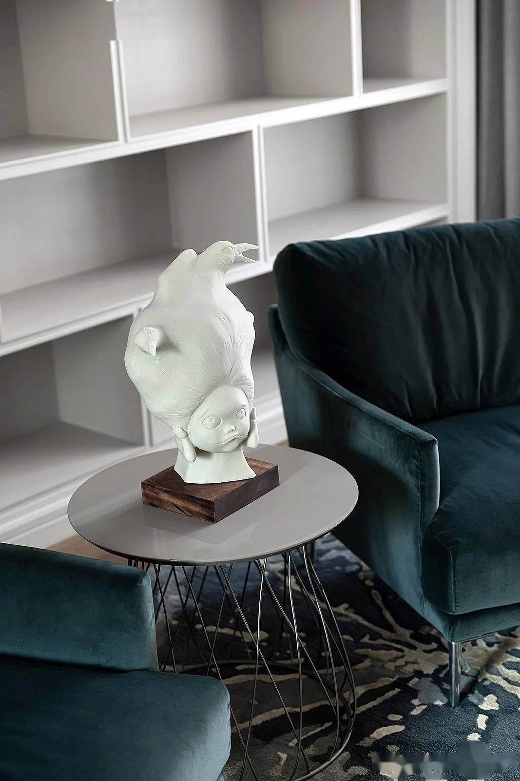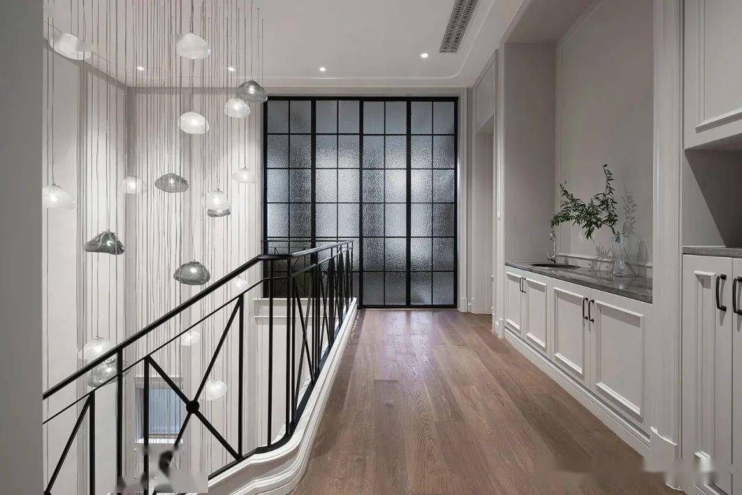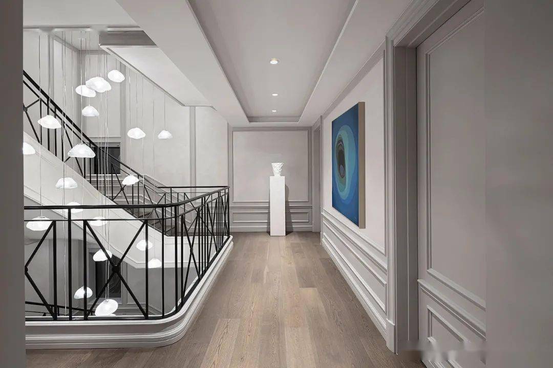 楼梯间的吊灯若隐若现,如星河散落人间,美好而纯粹。造型感十足的楼梯间本就如同一件艺术品,再相伴挂画、雕塑点缀其中,大美无形的凝聚力就是这个家最好的内在性格。