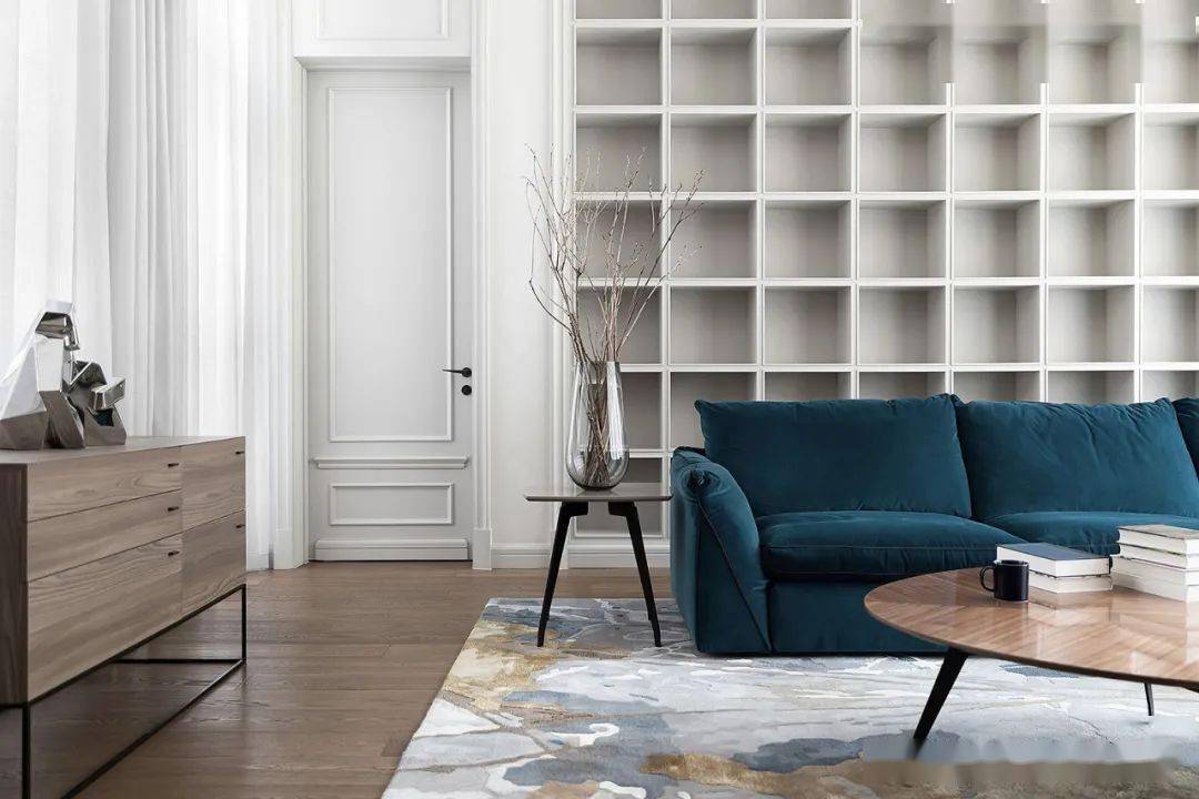 客厅开阔自由,有现代设计中干净、简约,大开大合的洒脱、轻盈美感,也有法式线条勾边,精心却不抢眼的内敛精致美感。在这里一切家具、装饰都在退让,只保留纯粹的蓝与白营造氛围。