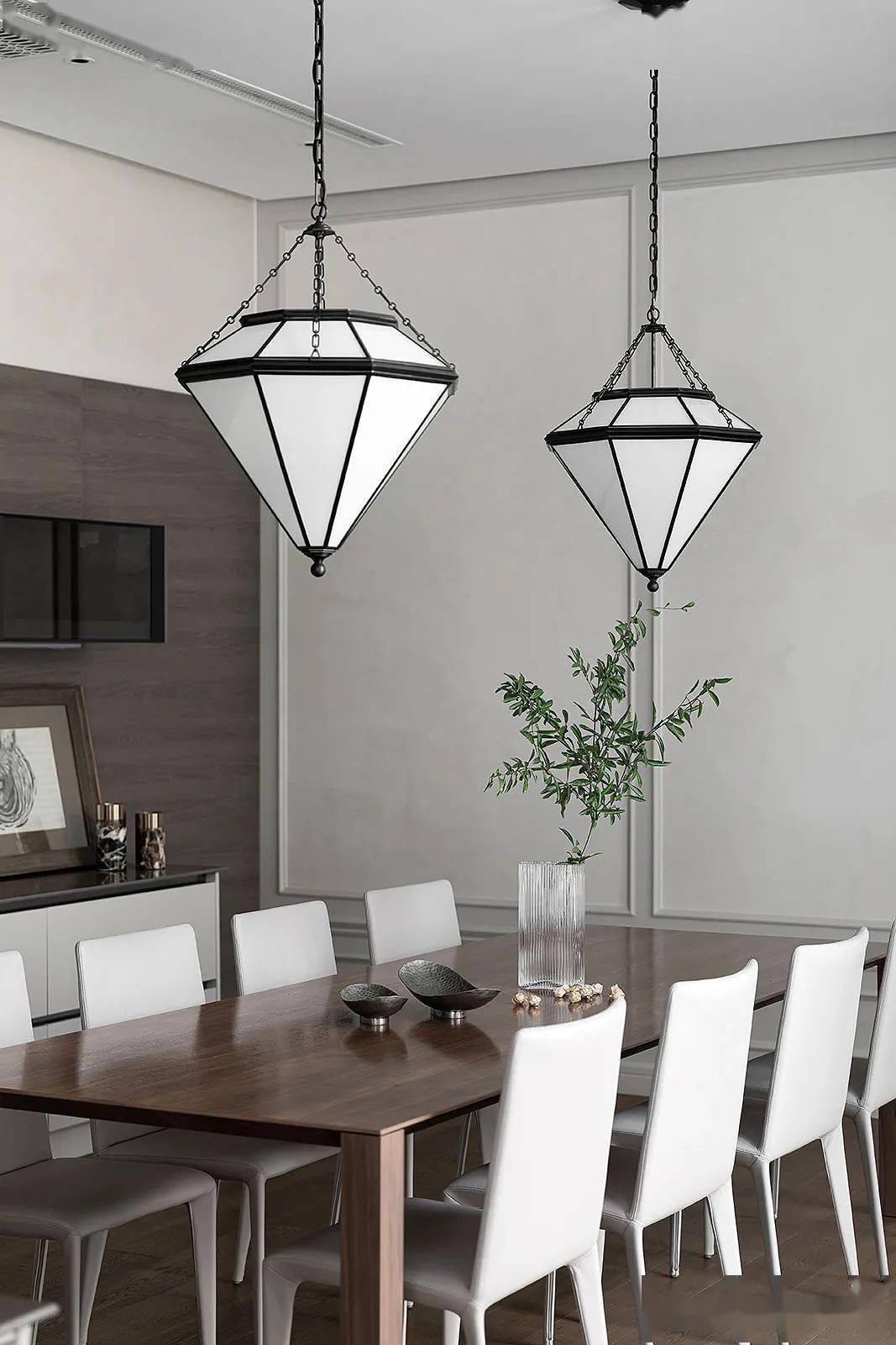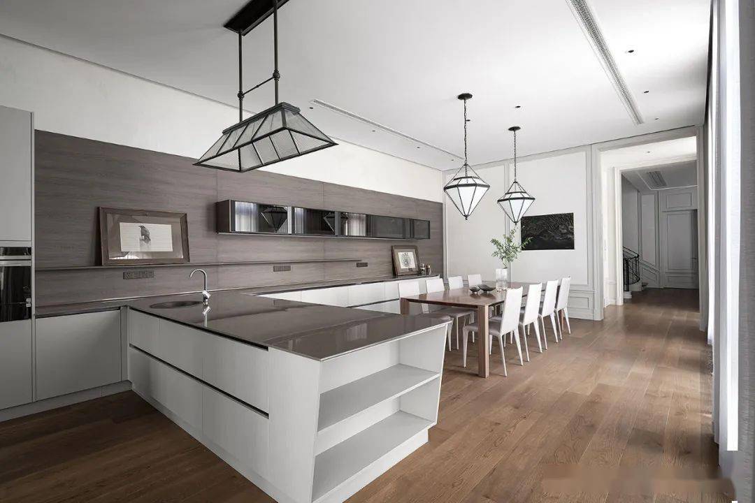 操作台上的绘画为业主收藏,和谐融入空间氛围,不同造型与材质的灯具相互呼应为整个餐厨空间带来层次感。