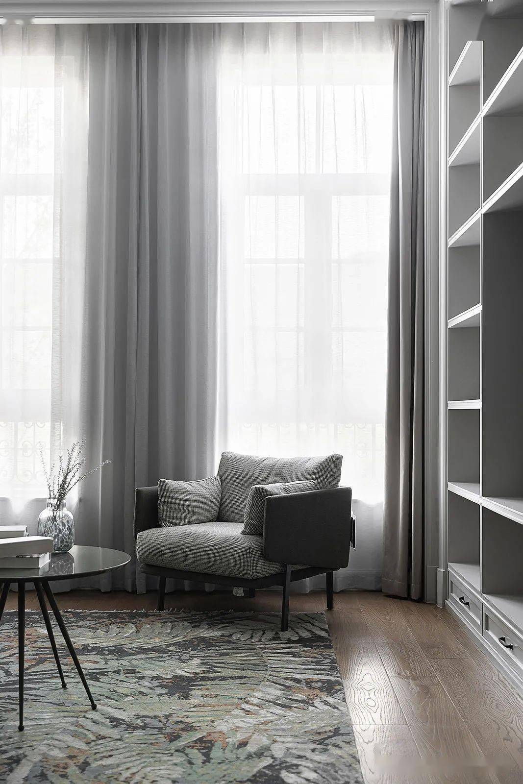 但功能的融入是润物细无声的,从庭院到玄关,优雅的灰色延续,室内外两种心情缓冲,生活故事也在慢慢讲述。
